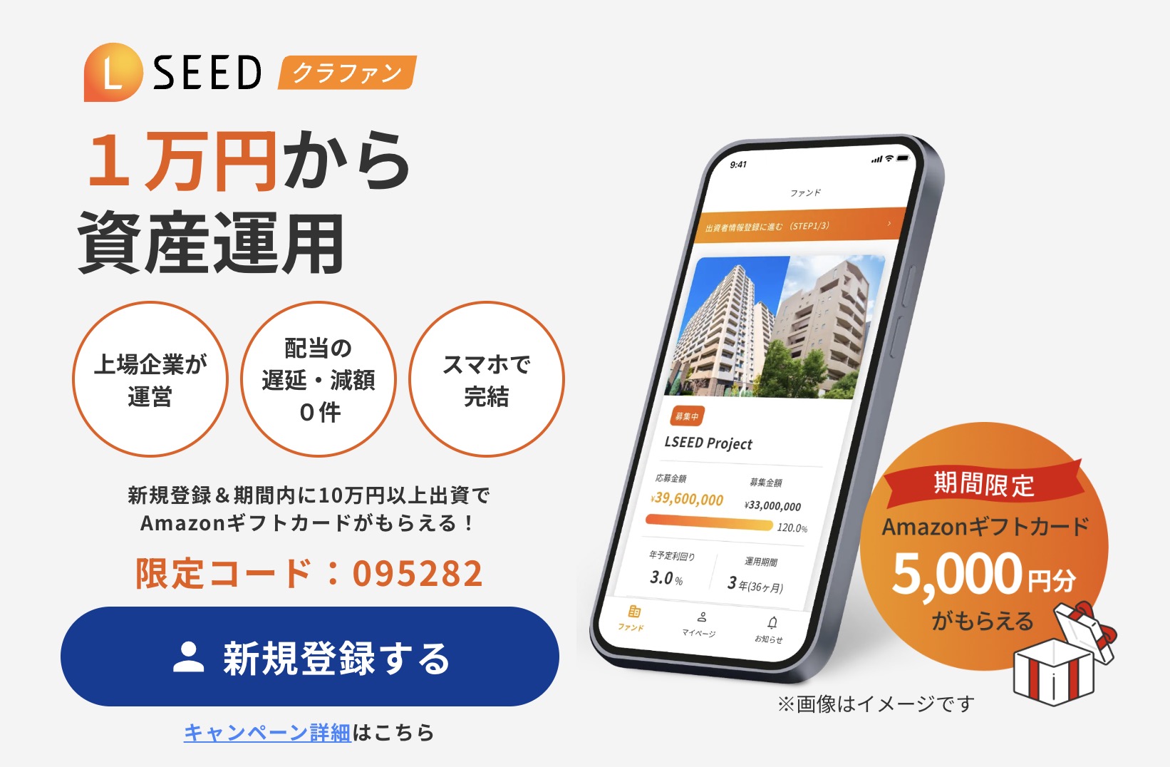 またLSEEDは、新規登録&10万円以上出資でAmazonギフト券5,000円のアマギフがもらえる、過去最大級のキャンペーンを実施中です!