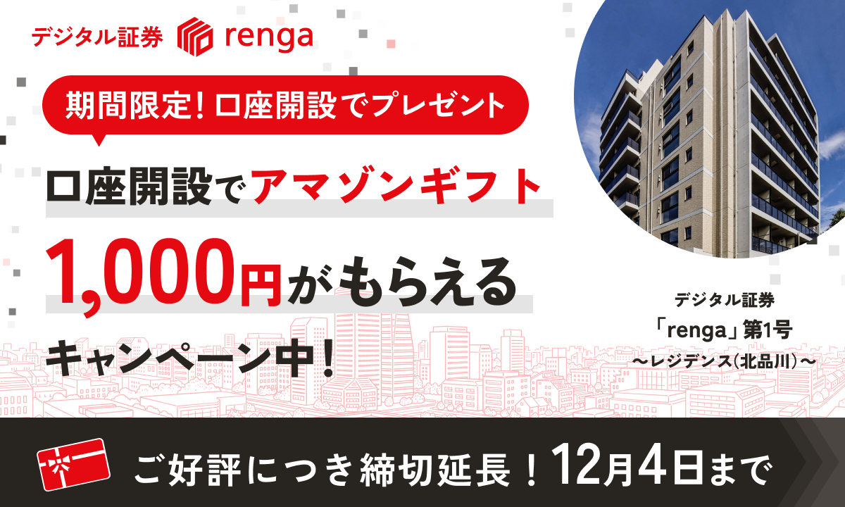 rengaでは新規口座開設で1,000円分のAmazonギフトカードをプレゼントするキャンペーンを実施中です。(2025年12月現在)