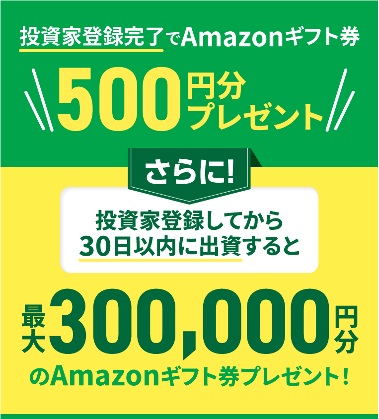 また、TSON FUNDINGでは新規投資家登録でAmazonギフトカード500円分、初回投資額に応じて最大30万円分がもらえるキャンペーンを実施中です!
